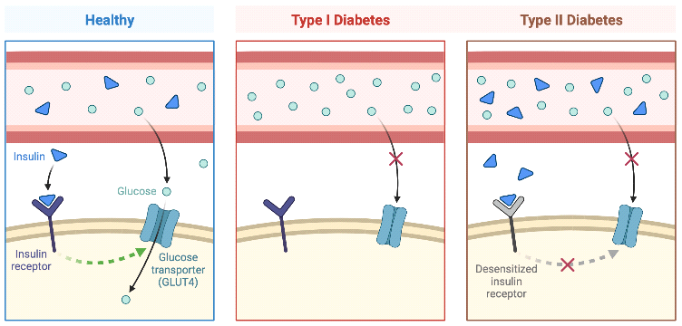 Figure 2: Pathogenesis of type 1 and type 2 diabetes. A healthy pancreas reacts to an increase in blood glucose levels with rapid insulin secretion by the beta cells, which leads to glucose uptake in various tissues. Type 1 diabetes is caused by a lack of insulin due to destruction of the beta cells, which prevents glucose uptake from the blood. Type 2 diabetes is caused by reduced insulin effect or production and also leads to rising blood glucose levels (image created with biorender.com).